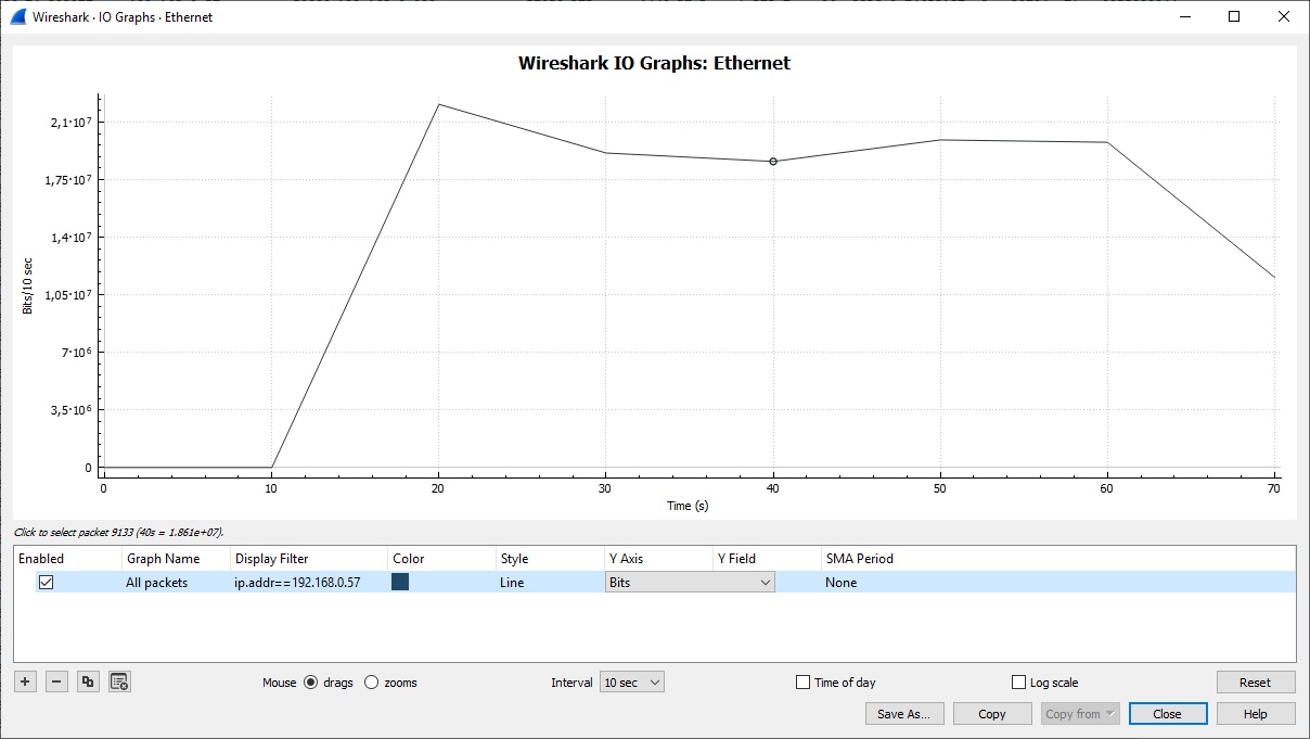 As you might recognise, this screenshot is made using Wireshark. It mentions 2 * 10 7 bits per 10 seconds = 2 Mbit/s. This is an average value, it is not all what the switch needs to deal with at a given point in time. On a smaller timescale, the speed doesn't vary around 2 Mbit/s. It varies between zero and the linespeed, 100Mbit/s. Or better: it is either zero (most of the time) or it tries to get as close to 100Mbit/s as it can (when there is a frame to transmit).