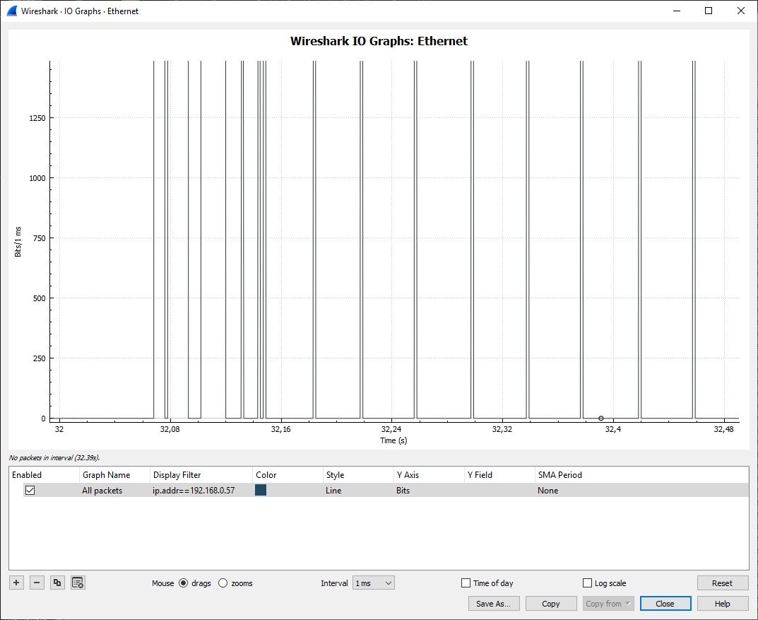 Here we see the same data zoomed-in. You see spikes surrounded by a lot of silence.